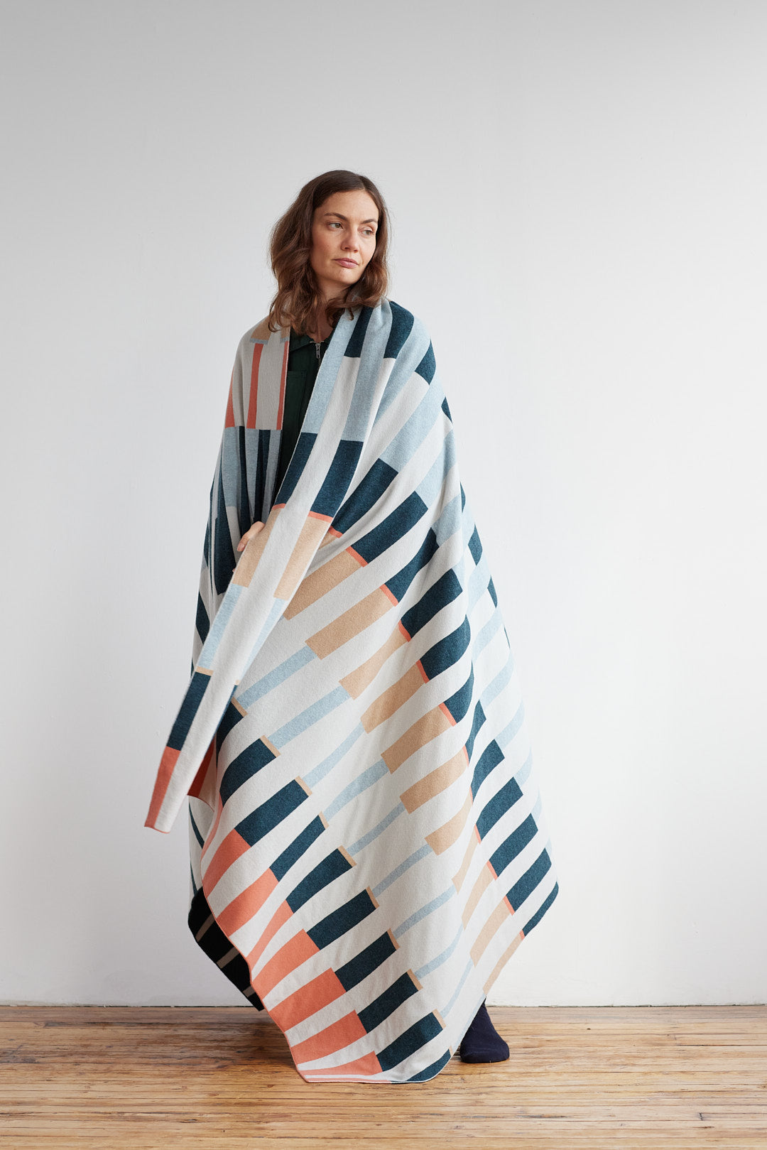 The fine reversible jacquard knit results in the colours in each row being swapped on the reverse. This creates a shift in emphasis and colour from one side to the other.