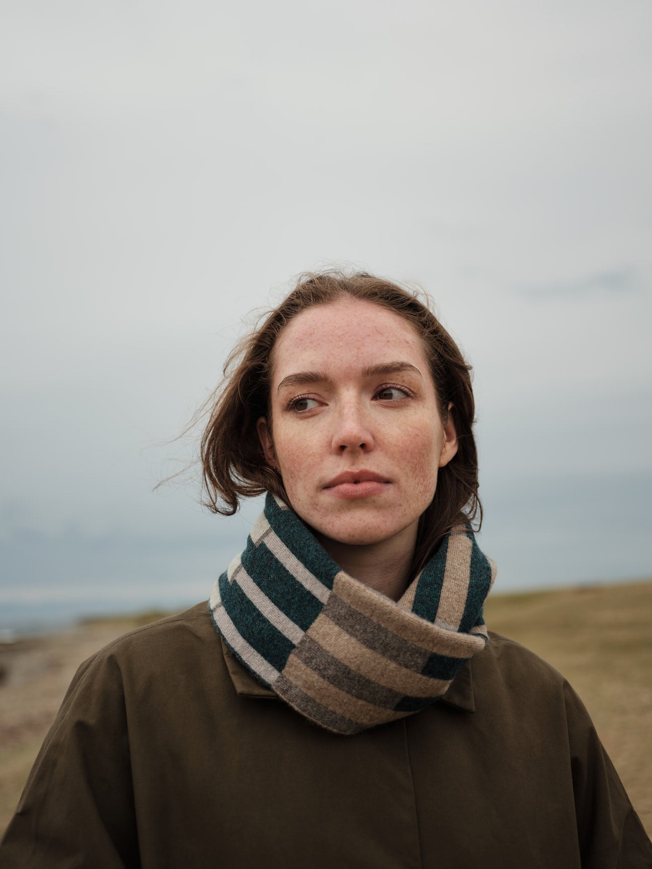 This year we have scaled up the pattern on our best selling "Harbour" circle scarf, for a cleaner and bolder, colour-blocked effect. The scarf though is exactly the same size as previous versions.