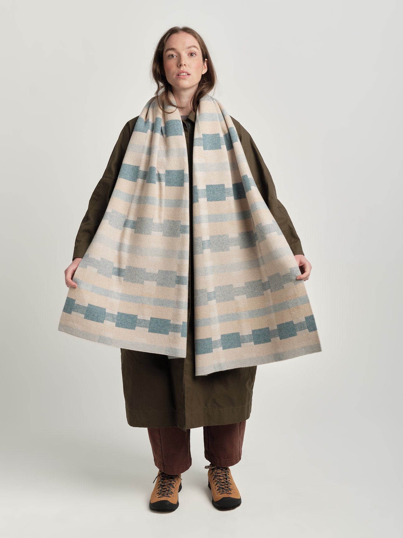 A large scarf, knitted in a reversible jacquard so, like a Welsh woven blanket, the colours of the pattern are inverted for a bolder expression on the reverse.