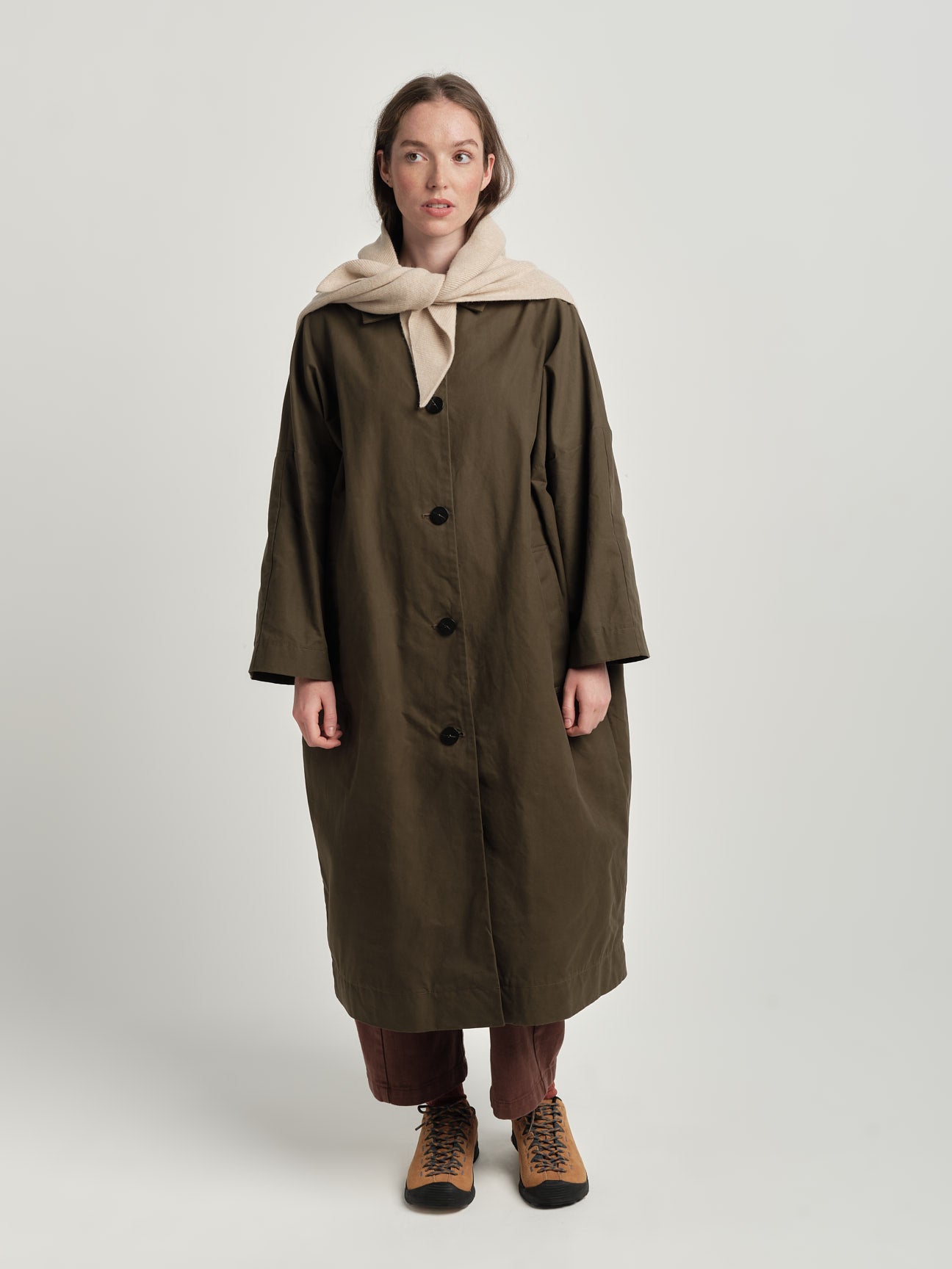 Our take on a neckerchief. "Swift Tail" is a nearly-square piece of extremely soft delicate ribbed knit, folded corner-to-corner and pressed to create an origami-like scarf, with a pair of offset tails at the back.